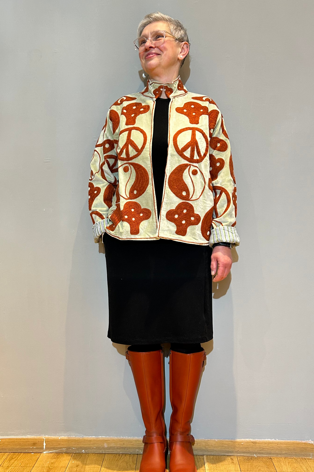 This stunning 100% cotton jacket is a radiant expression of color, culture, and craftsmanship. Each piece is entirely hand-embroidered by skilled artisans, featuring intricate motifs inspired by traditional Central Asian embroidery.