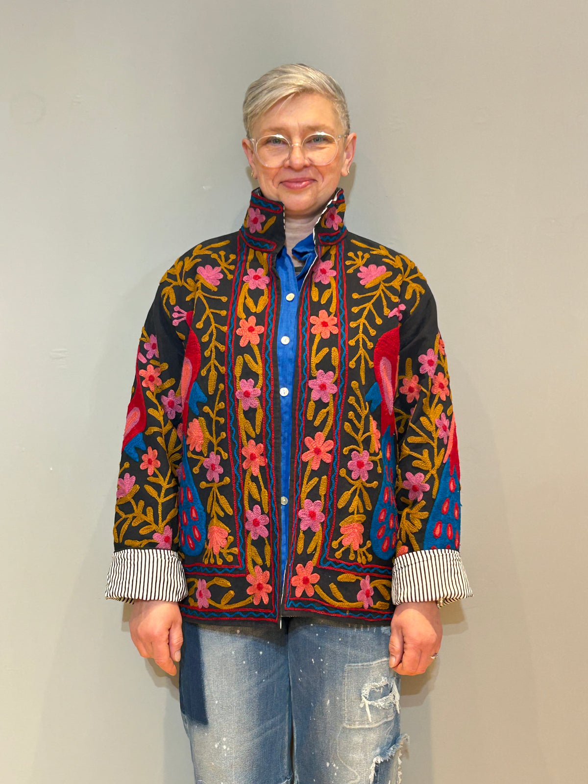 Each stitch tells a story — hand-embroidered by master artisans using traditional Central Asian techniques passed down through generations. The intricate floral and peacock patterns create a stunning visual symphony that transforms this jacket into a wearable masterpiece.