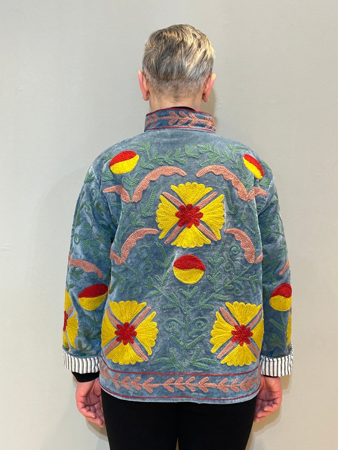 Discover serene sophistication with this exquisite 100% cotton jacket in soft ash turquoise. Showcasing the timeless art of Suzani embroidery, this piece features intricate floral motifs in vibrant threads that create a stunning contrast against the muted turquoise backdrop.