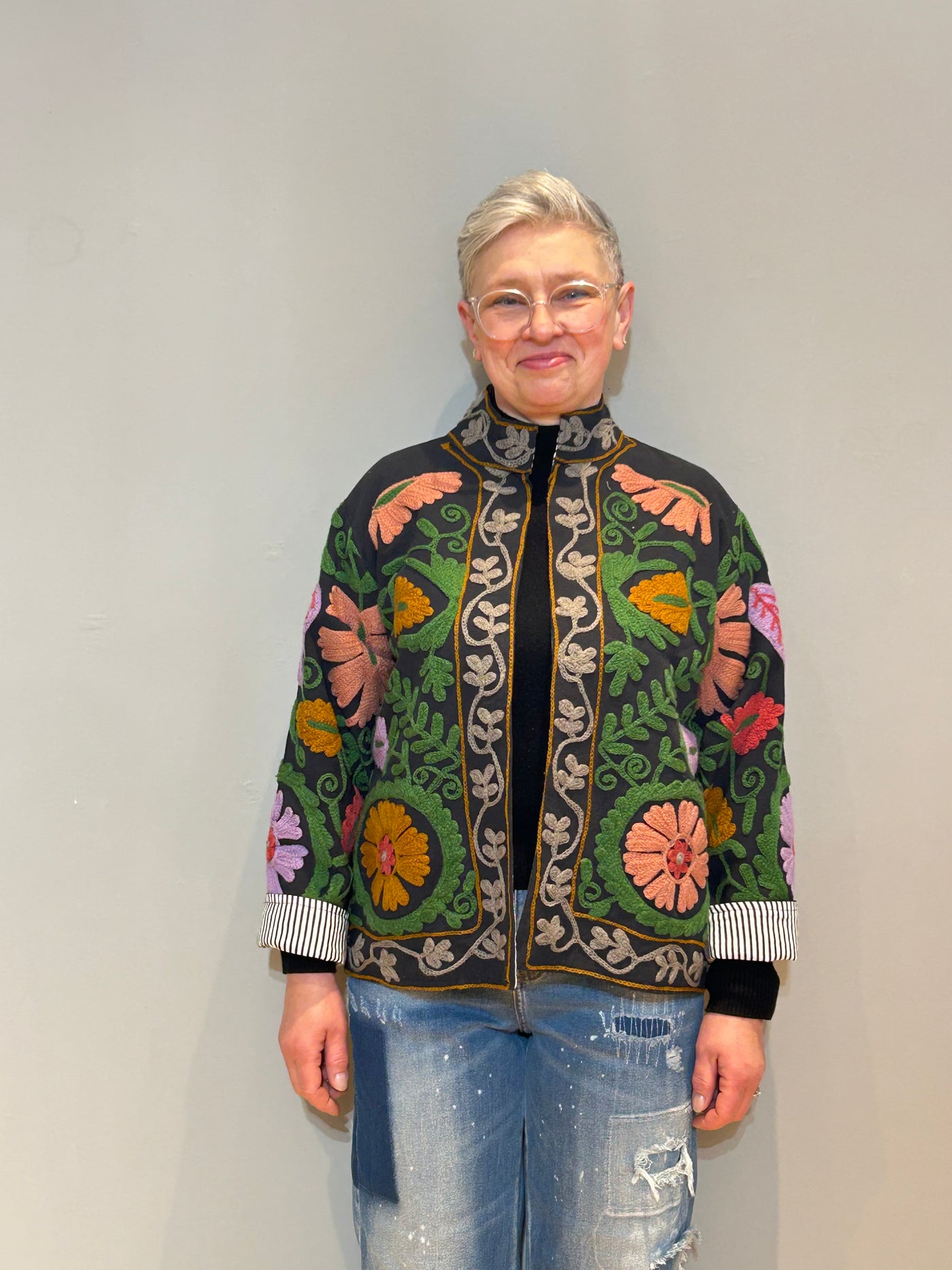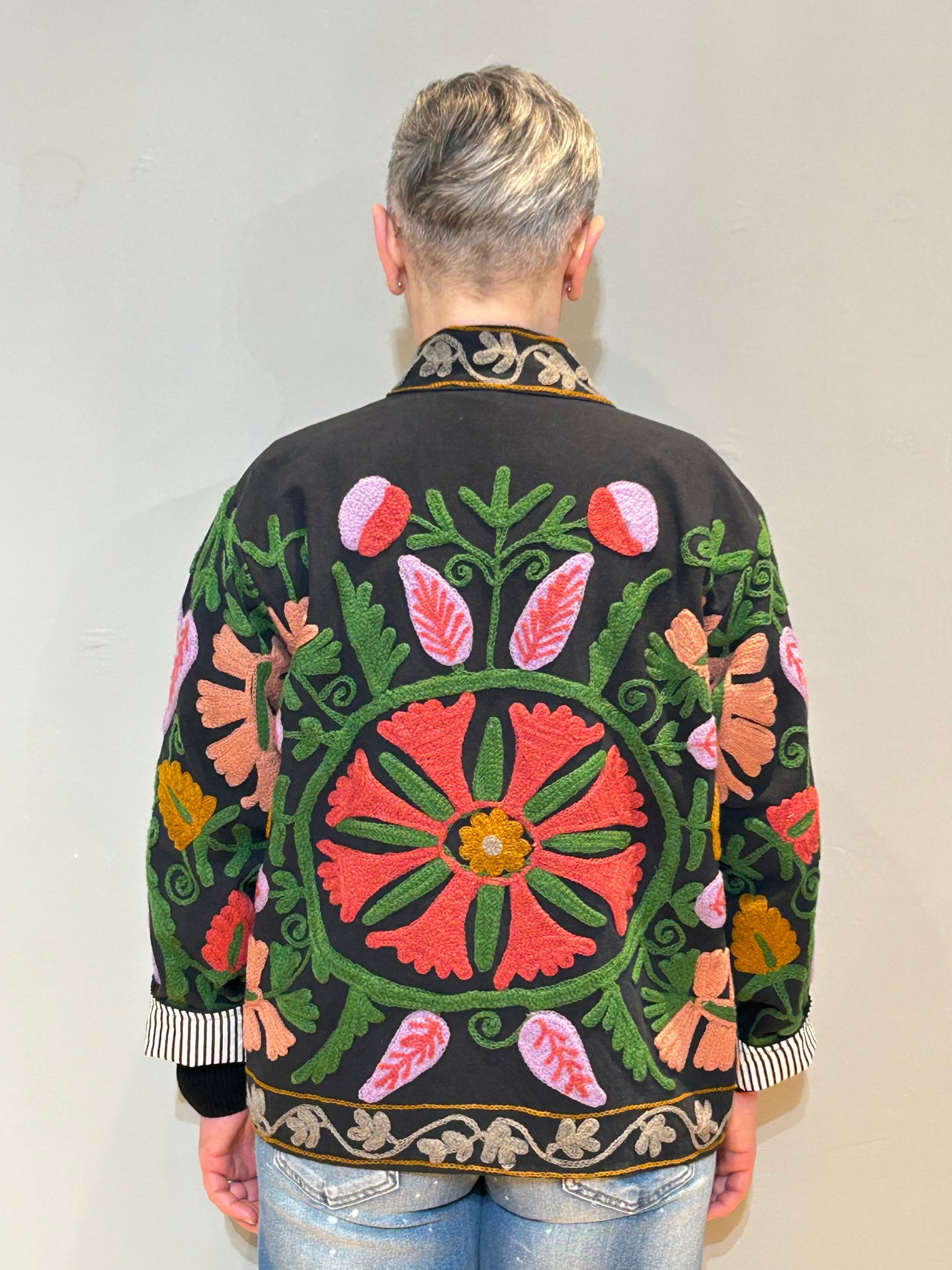 Immerse yourself in the lush beauty of nature with this exquisite 100% cotton jacket in deep jungle green. Showcasing the timeless art of Suzani embroidery, this piece features intricate floral motifs in vibrant threads that beautifully contrast the rich, earthy backdrop.