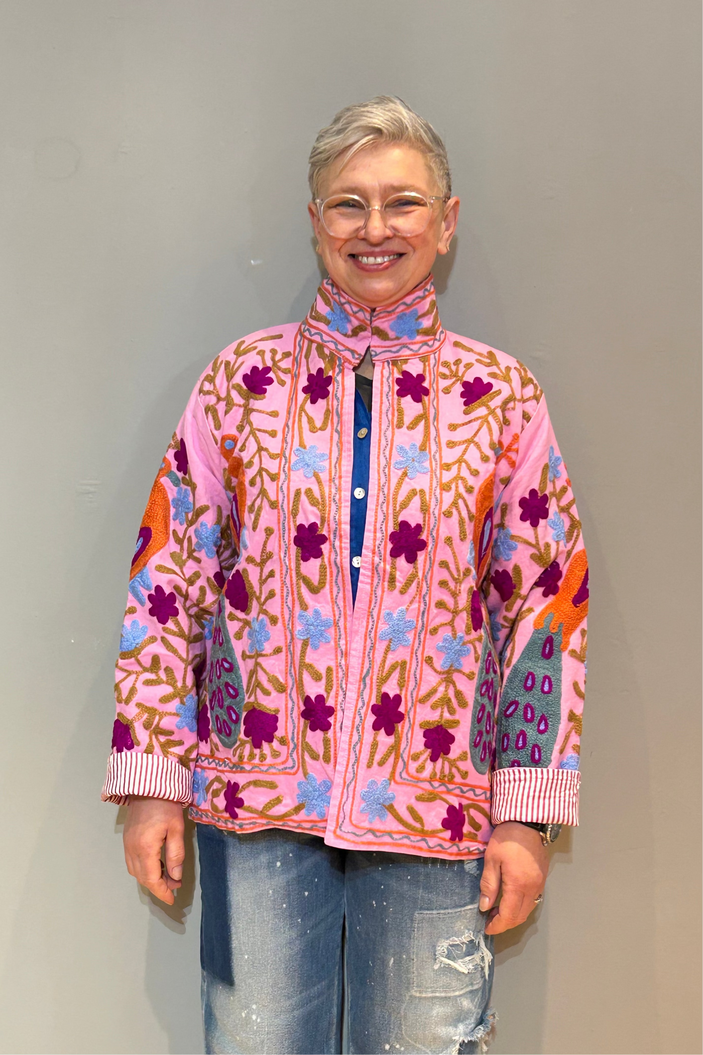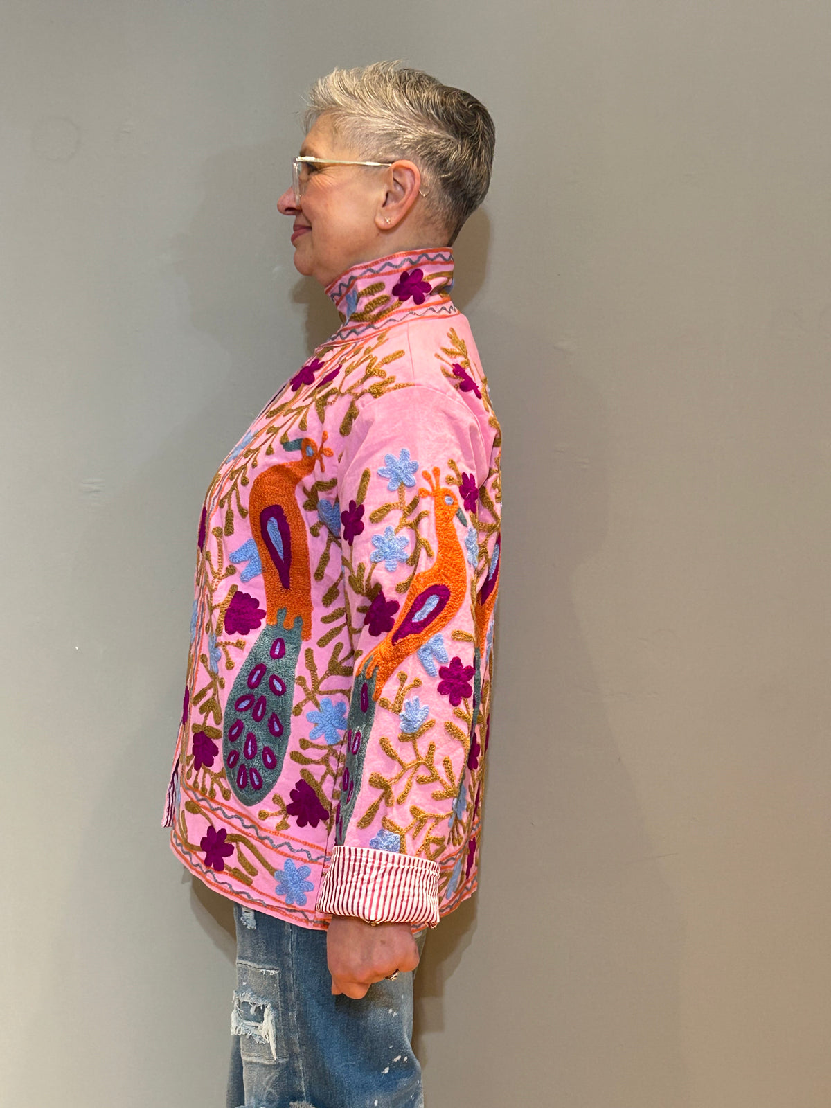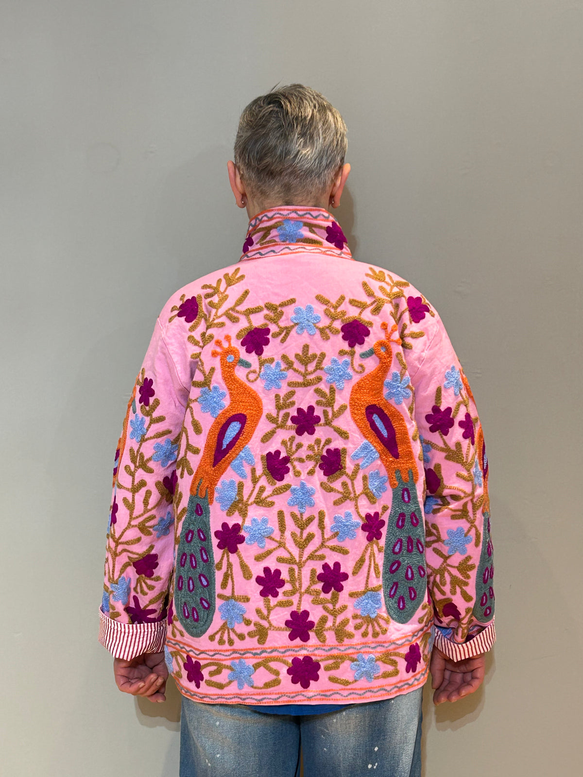 Embrace feminine charm with this exquisite 100% cotton jacket in beautiful pink, adorned with stunning peacock (Pfau) motifs. Showcasing the timeless art of Suzani embroidery, this piece features intricate peacock and floral patterns in vibrant threads that create a captivating contrast against the soft pink backdrop.